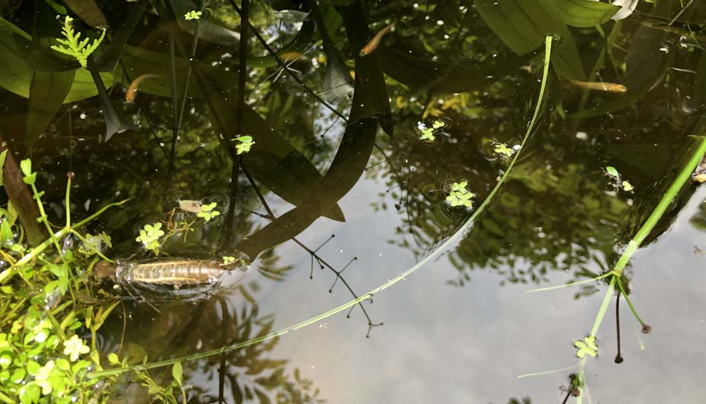 水生植物のナガバオモダカは繁殖力が強く、次々と根を伸ばし池一杯になる。そのため間引きしていたらヤゴが浮いていた。