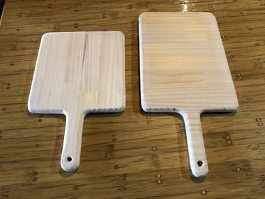 カッティングボード DIY 2019-03-24 カッティングボードを作るため、久々に糸のこ盤を使う。直線やコーナーのカットが思うように行かず。日々利用することの大切さを感じた。サイズは縦255mmx横180mmと縦195mmx横180mm、厚さ15mm。 ピザトーストとボード