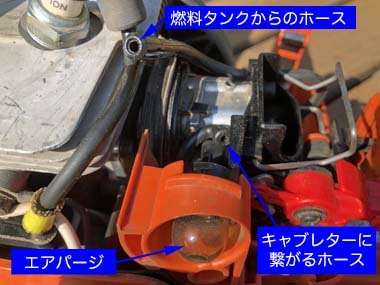 伐採した木を頂に行く。木が置いてある場所で定尺にカットしてから運ぼうとチェーンソでカット作業をしていたら、エンジンが停止した。燃料が切れたかと思い燃料を確認するとまだ残っていた。購入して6ヵ月で故障か?といやーな予感が頭を過ぎる。エンジンを始動するときに燃料を送るエアパージを押すと「ヒュー」と空気が漏れるような音がして、エアパージに燃料が入らない。エアパージからキャブにつなぐ燃料ホースがエアパージのところで外れていた。振動で外れたのか?(ハスクバーナ135e)繋いだ後はエンジン始動OKとなった。