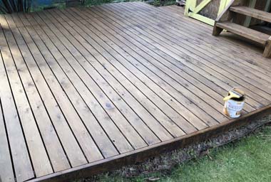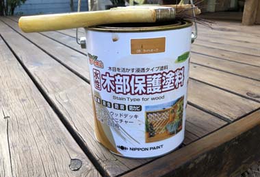 デッキに塗装 DIY 2021-10-14 水洗いで掃除してからちょっと日が経ってしまった。気温が高い日が今週ぐらいまでのようなので塗装を行う。塗料は日本ペイントの「水性 木部保護塗料」、色は「ライトオーク」 1回塗りで終わり。太陽の光が当たらないからか、塗装前後であまり変わらないように写っているが、色あせた色と表面のカサカサ感はなくなった。