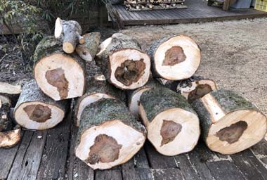 ナツツバキの次は太さが30〜40cmぐらいのトチノキを頂いた。トチノキは落葉広葉樹の高木で昭和中期以降は一枚板のテーブルに使用されたとのこと。(ウィキペディアより)