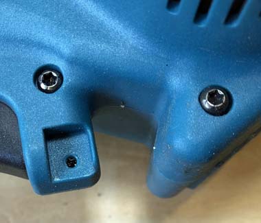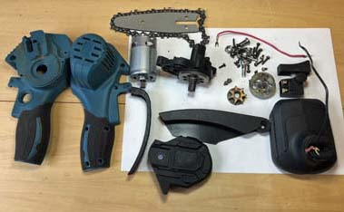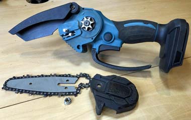 枝の定尺カット作業の3回目を始めたらすぐに、ミニチェーンソー(電動)が動かなくなった。え〜、と思いながらバッテリーの充電を確認 → OK。本体を振ってみると「カラカラ音」がする。何かが本体の中で自由に動くと思われ故障か?