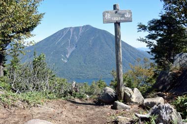 予定を変更して社山に登る。山頂の山名板の後方にあった木々が伐採され、背景に男体山の全景が入るようになっていた。
