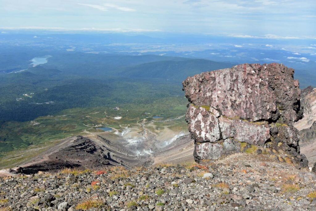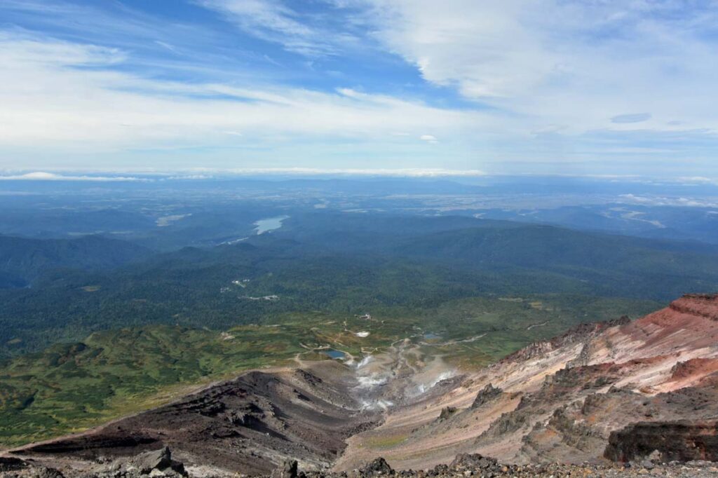 山頂から姿見駅の方向を写す。 登ってきたルート(左側)は傾斜がきついザレ場、噴気、姿見の池、麓の東川町が見えていた。