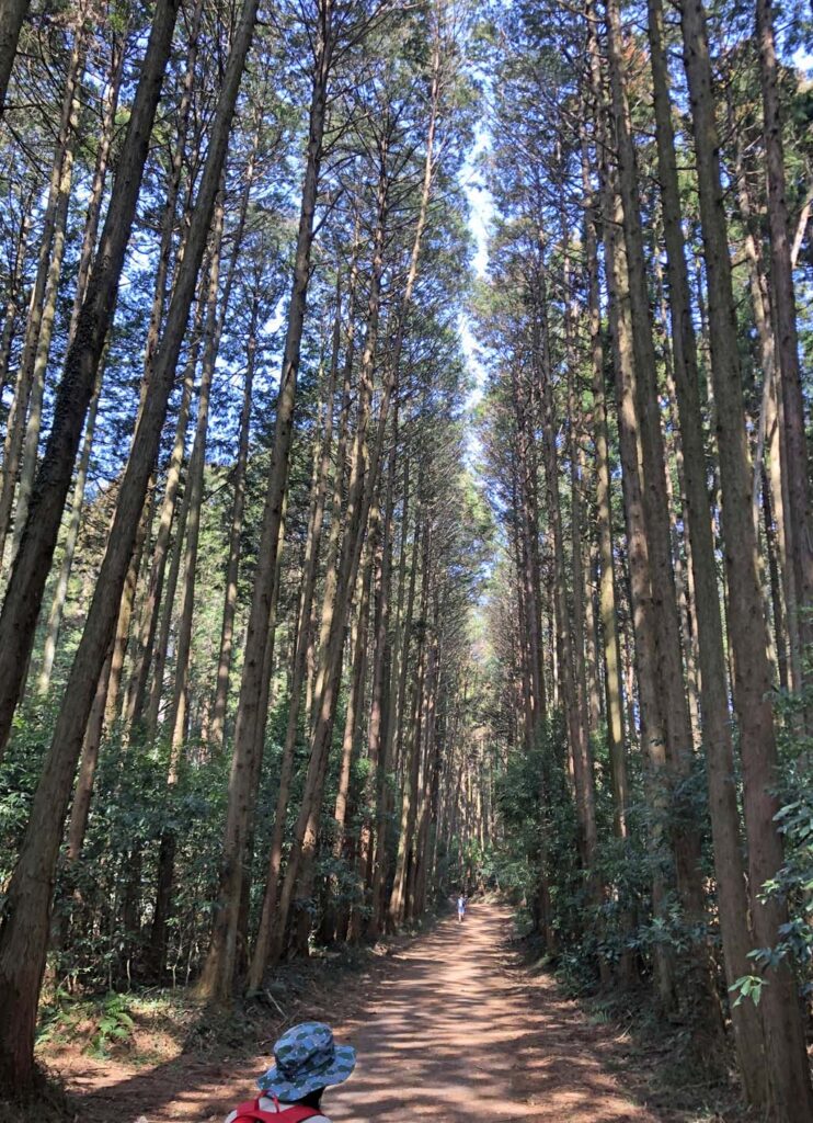 参道は針葉樹で木漏れ日がある。雨の時期以外は山道の石畳も滑らず歩きやすい