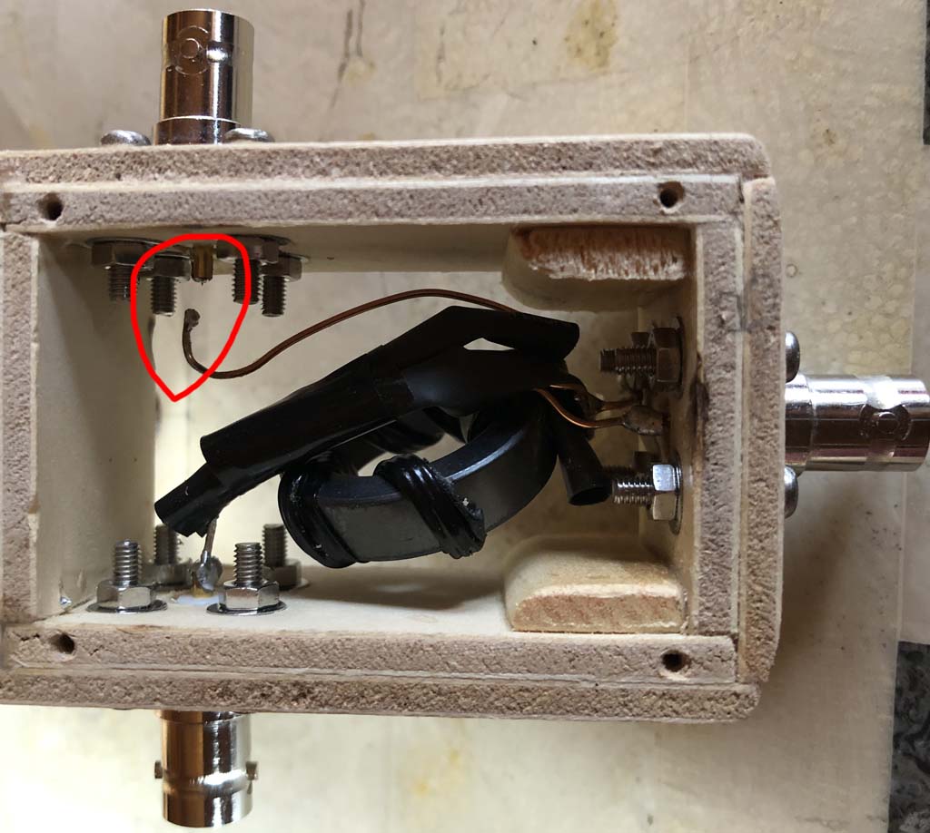 アマチュア無線の運用はSWRが高く行えず。家に戻ってアンテナの部品(バラン)を分解したら断線(赤丸)が見つかった。これはハンダ付の不良か?自作品なので自己責任でした。とほほ