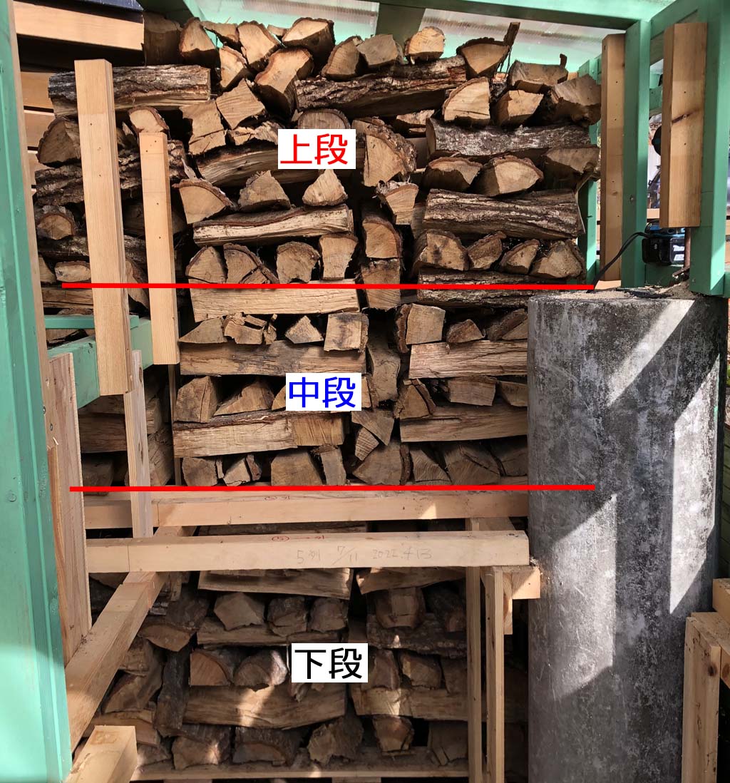 各段から10本の薪を選んで測定した結果(測定方法などは2年前と同じ)