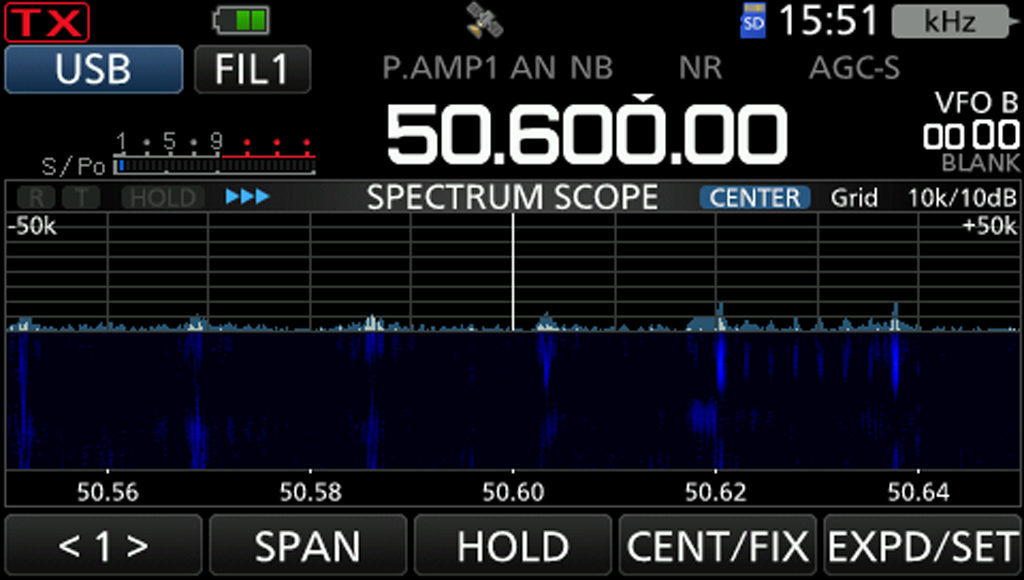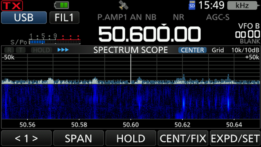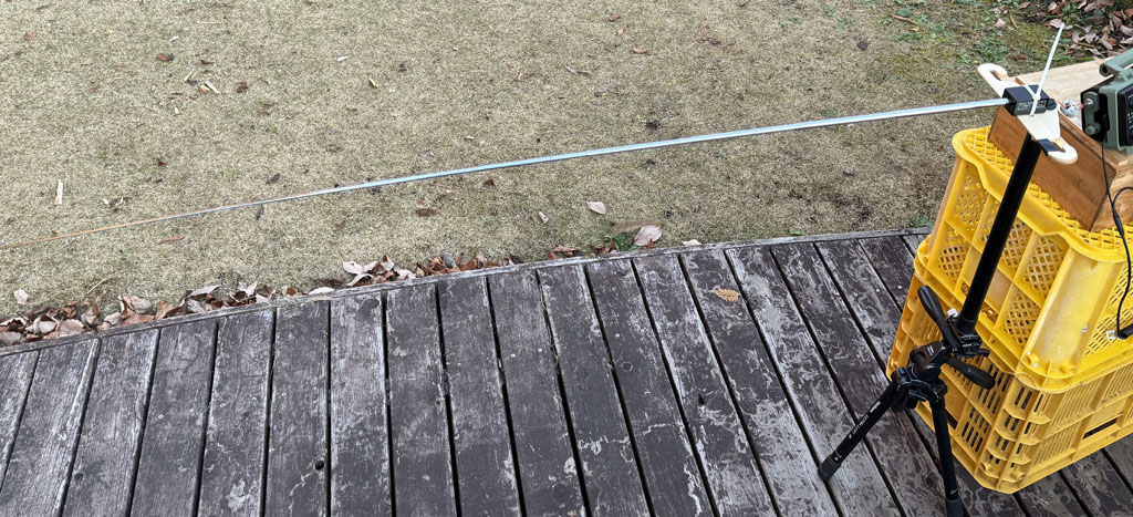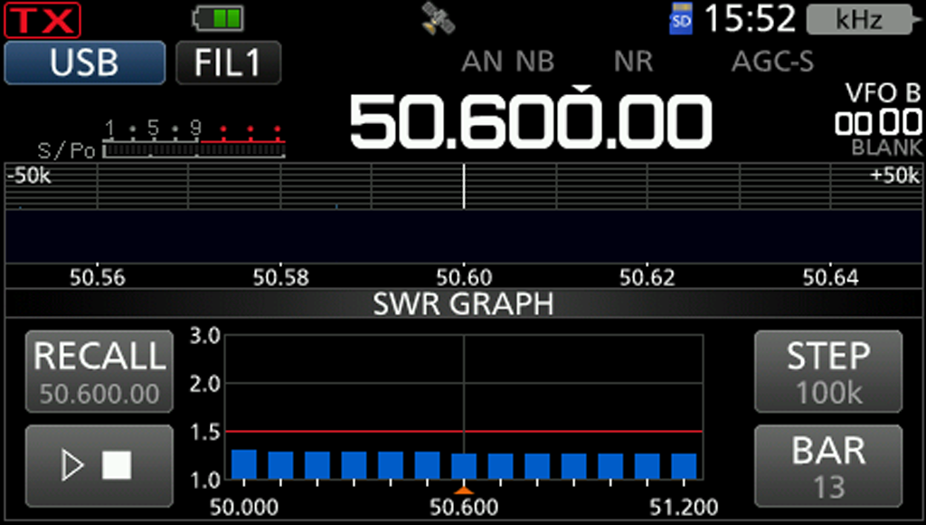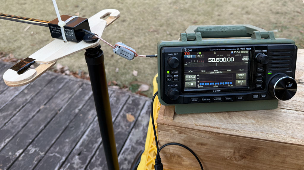 SWR測定前にこのシステムも端部給電アンテナ仕様なのでノイズを確認しました。ノイズは波のように大きくなり、その後小さくなるのを繰り返す事象でした。(自作した「気軽に使える50MHz用アンテナ」も同じ傾向でした。)画面はIC-705です。