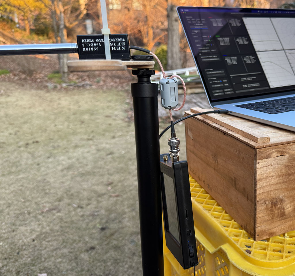 BNC-SMA変換コネクタを介してNanoVNAへ接続し、測定データはパソコンで確認しています。