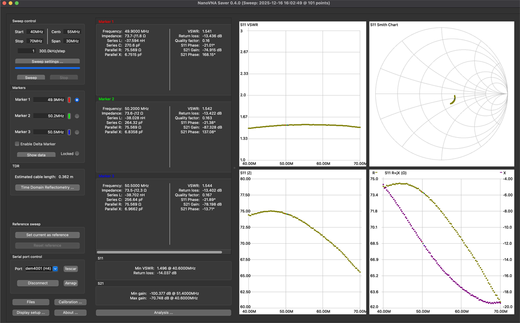 測定範囲は40MHz〜70MHzでなだらかな変化でした。