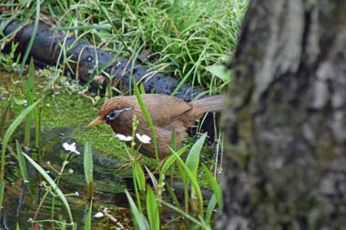 池で水浴びをするガビチョウを見かけるが、近づくと逃げてしまう