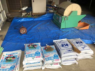 あらぐれ(代かき)前に田んぼに入れる肥料準備。数種類の肥料を「まぜた君」の筒状の所へ投入して混ぜる。(肥料一袋の重さ20Kg)