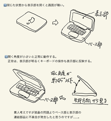 早々にAppleへ問合せすると液晶が故障下とのことで修理を依頼した。ただ、表示部の開度が45度以下ならなんら問題なく使えるので、ほかに原因があるのではという思いは払拭できない。検査すれば問題点がわかるであろうと思っていたが、「バックライトの問題」やはりしっくりこない。バックライト本体の故障なのか、そこに供給する電源系なのか、サポートに電話したが回答は得られず。修理代を考えると具体的な問題を教えて欲しかった。キーボードの修理に続いて、またまたいやーな思いをした。