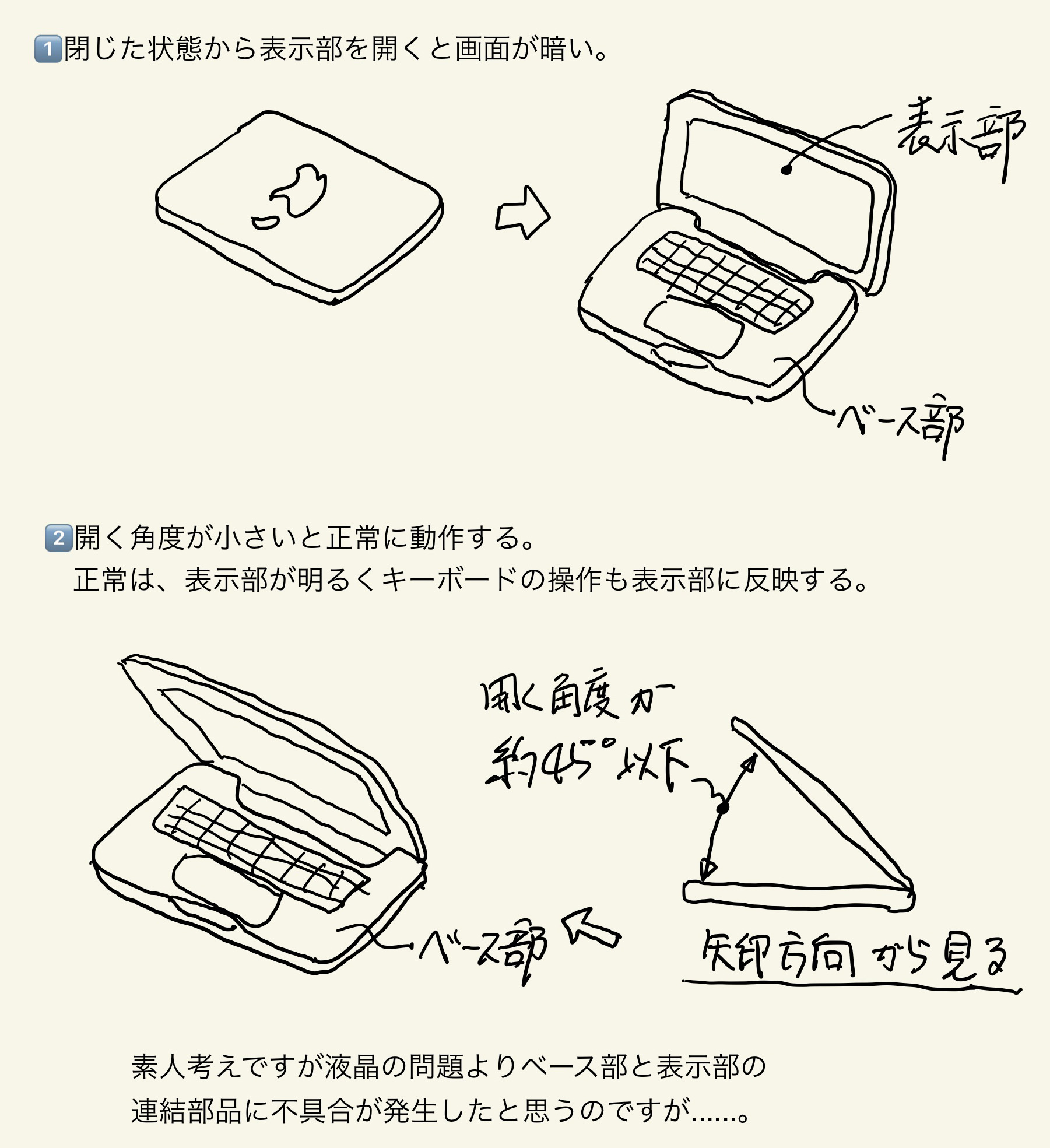 表示部を閉じた状態から45度ぐらいより開くと何も表示されない。