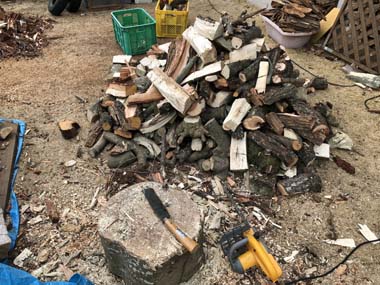 薪作り作業(今年8日目) DIY,薪活とストーブ 2019-02-27 玉切りした「梅の木」と「モチノキ」の細めの幹を割る作業なので、前回に比べると出来高が増えた。庭で作業をしていると近所の家に造園屋さんが、、、桜の木を選定するとの事で頂きました。