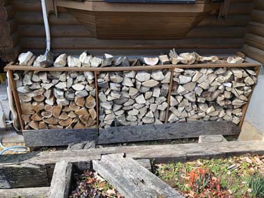 薪作り作業(今年11日目) DIY,薪活とストーブ 2019-03-08 先週、ベランダ下に積んだ時の余った分と、今日の薪割り作業の出来高で幅2.9m x 高さ1.1m x 奥行き0.4mの薪置き場が満タンになる。ここのストックで約0.6ヵ月分(約1.3m3)の燃料になる予定。2年後に使う薪のストックはまだ足らない。もう少し薪集めを頑張ろう。