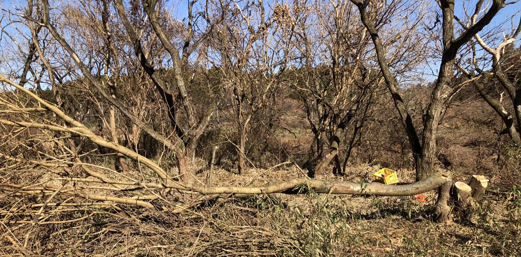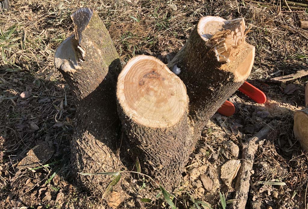 薪作り作業(2023.12.13) 薪活とストーブ 2023-12-13 前回に続き株立ちのカエデの残り1本を倒し枝払いを行った。カエデは硬い木のためソーチェーンの切れ味が悪くなるのが早く作業効率に影響する。例えば切れないと力を入れて切ろうとして疲れ、切り終えるまでの時間が長くなる。そして、エンジンの回転数も上げるので燃費が悪くなる。など。 ゆっくりと倒れたので硬い木なのだろう 株立の根本 次回は作業前に目立てを行おう