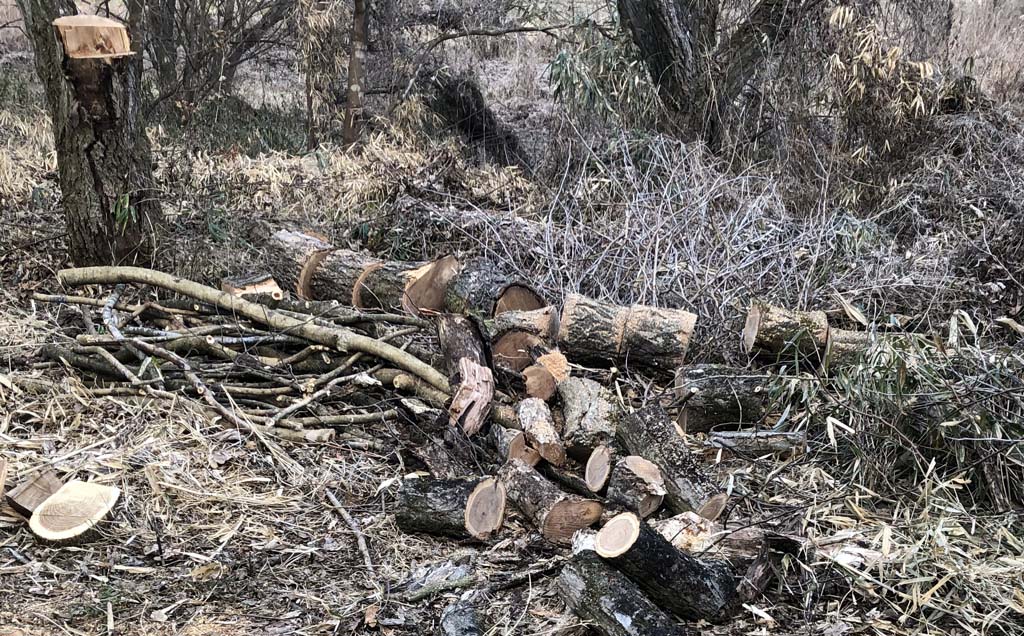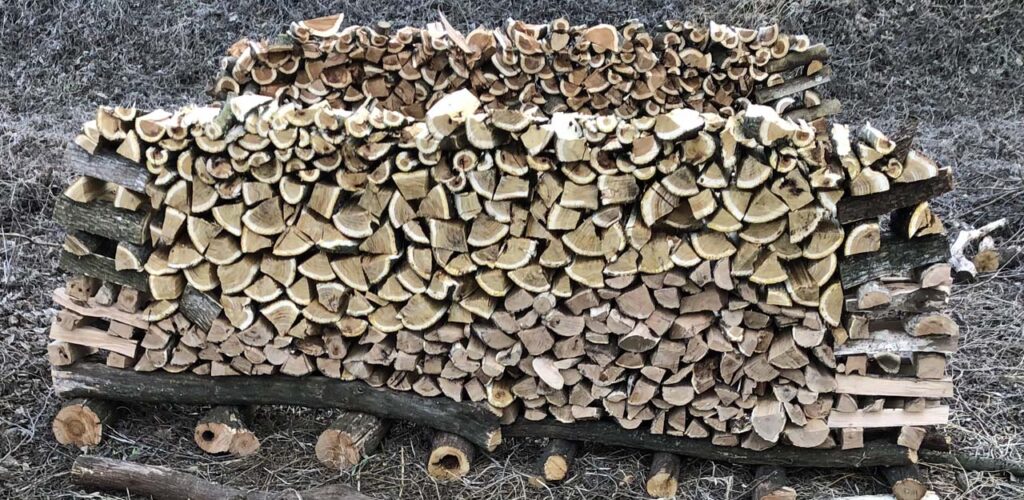 今日は薪割りから始めたようと、10日に玉切りにしていた丸太を薪割り台に乗せたら、切り口の一部がうっすらと凍っていた。午前中で仮置き場の2列目が出来るまで薪割りは進んだ。
