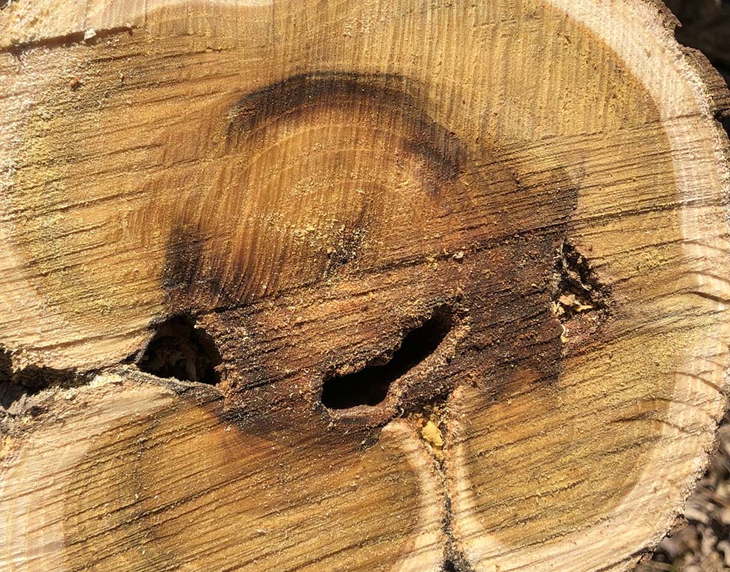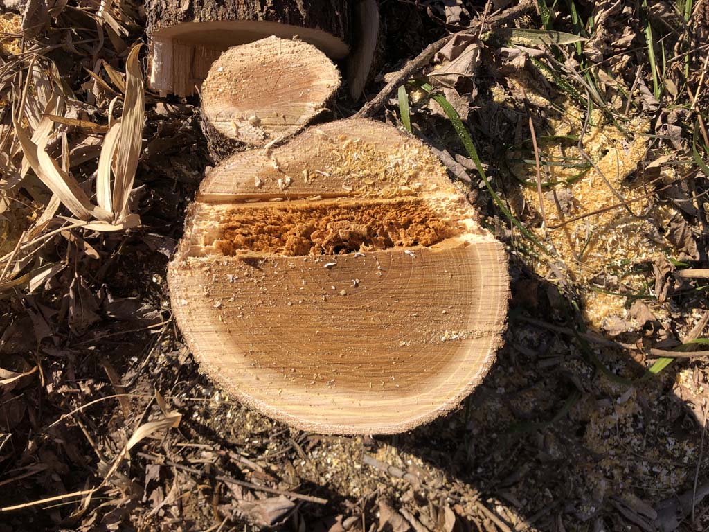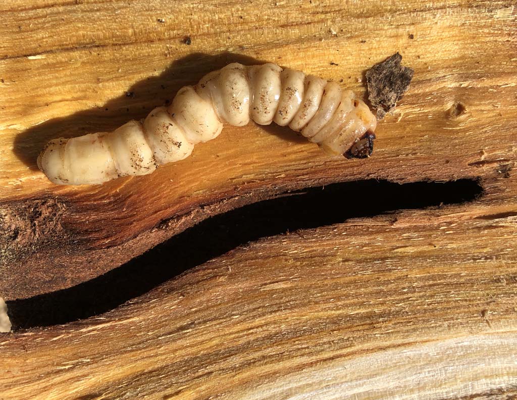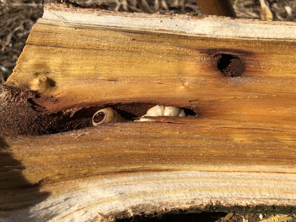 薪割りを行うと蛹室(ようしつ)に幼虫を発見