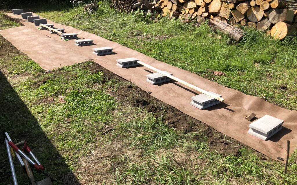 草刈りを行い整地、除草シート(デュポン 防草シート ザバーン 240BB) を引いて、基礎に相当するところはブロックを使う。この防草シートは不織布タイプなので仮払い機の歯があたっても繊維が絡まず安心だけど財布に厳しい価格だ