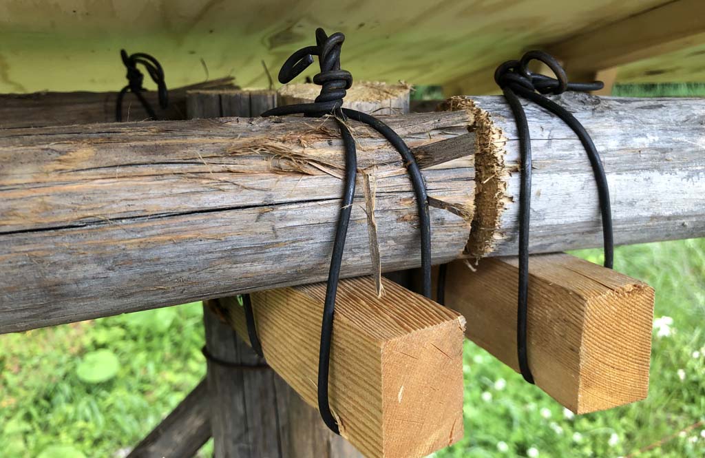 丸断面の交差は点接合のためコースレッドの軸力だけでは確実な固定ができない。それを番線(ナマシ鉄線#10)で固定を行い補う方法で固定した