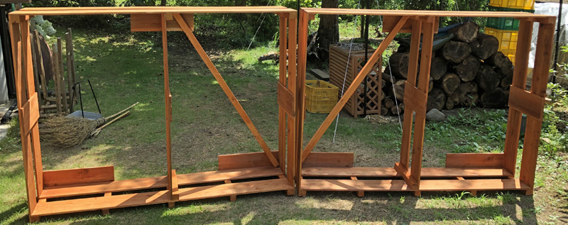 塗装も終わり薪棚(2個)が完成した。暑い日が続くが薪割り作業を再開しよう