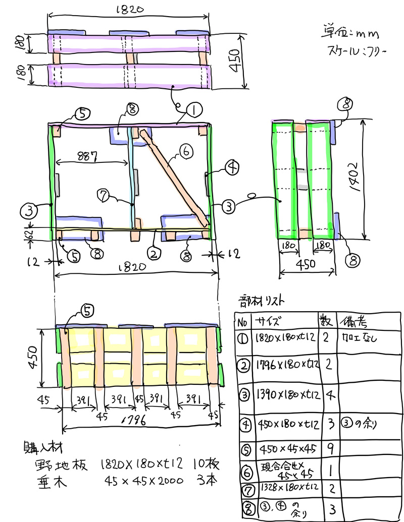 1 X 4材で作成した場合:4636円(薪棚1個分・筋交いはなし)