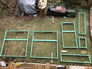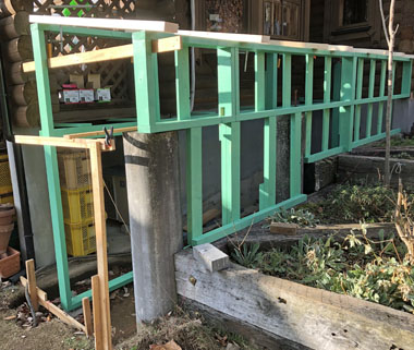 小さい枠は基礎の上に乗せて花壇の枕木へ固定。次の作業はそれぞれの骨組みの上面に屋根用の骨組みを作り設置する予定。