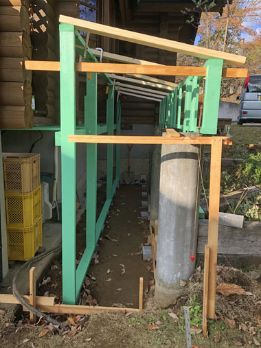 2X46ft(1830mm)材で枠と柱を兼ねた骨組みを作り塗装と設置まで進んだ。