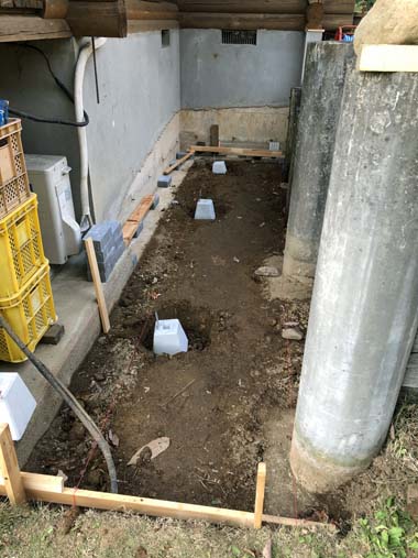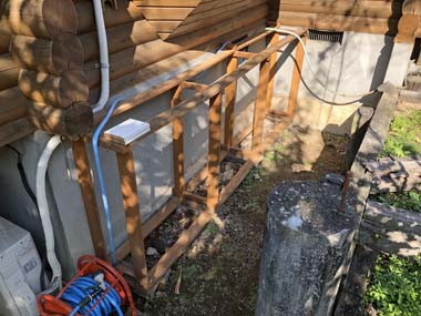 薪置き場の拡張 DIY,薪活とストーブ 2019-11-18 今年の4月頃で薪作りが一段落していたが、薪を置く場所が不足していた。置き場所は母屋の南側ベランダ下、西・北・東の軒下を使っている。今回、東側を拡張することにした。軒下なので雨に当たらないようにすると、薪を置くスペースが限定された。 薪置きラックは長さ40cmを一列積んでいた。 今回は雨に当たる部分に屋根を設け、3列+αに拡張する予定。床になる部分の束石を配置するところから始めた。