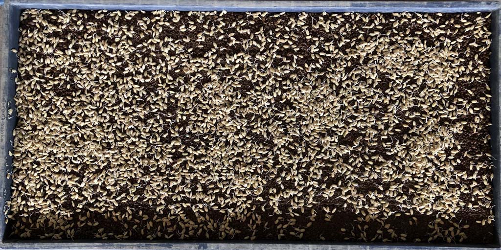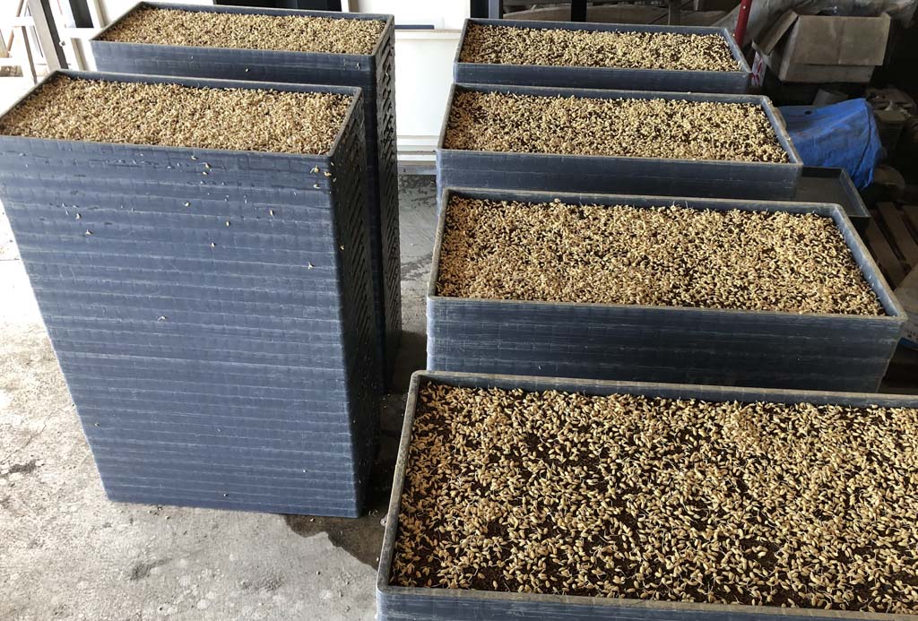 芽が伸びた種の弊害は種蒔き機で種を蒔くと目標より少く蒔かれる。そのため、種蒔き機の調整や種を揉んで芽を取り除いてみたり(ご近所の方から教えていただいた方法)、種の表面の水分を少なくした状態などで試行錯誤があり時間を要した。結局、種まき機で蒔いてから少ない分は手で蒔いて少ない分を補うことになった。