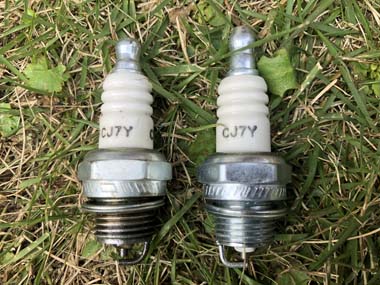 エンジンからプラグを外してみると電極の部分が濡れていたことから燃料は燃焼室まで来ている。点火系のトラブル? スパークプラグの湿り気をとってみたが症状は変わらず。近所のホームセンターで購入した「品番:CJ7Y」(右側)に交換したら始動した。左が付いていたスパークプラグ品番:RCJ7Y(Rはレジスタが付いた仕様)事前の準備が大切な事をあらためて感じました。