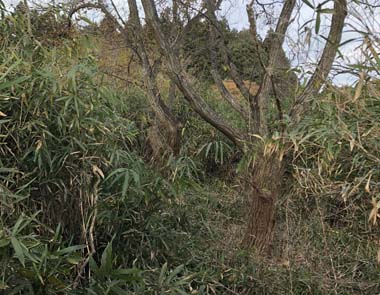木の周りが笹(篠)で覆われているところを刈り払い機で除草?を行い作業スペースを確保する。これで全ての木の伐倒作業が出来るようになった。(笹(篠)の除草作業はなかなか切れずに手強い。)