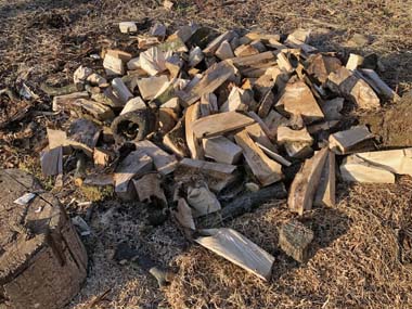 二股に分かれた部分や節が残ったところは斧で割れない場合、チェーンソーで小さく切ったり、それを斧で割る。