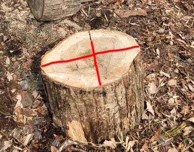 人の力で運べないためチェーンソーで十字に切込み(イメージ:赤線)を行いクサビで4等分に割る。