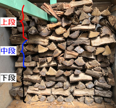 --------------中段------------------ 保管場所:東側 11 列目の中段から10本の薪を選ぶ 測定箇所:下段と同様 測定結果:15〜20%・平均:18.0%(11列目) (写真を撮るのを忘れた。トホホ) 注:扇型の断面は三角形、弓形の断面は半円として 簡易な計算とした