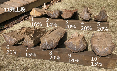 --------------上段------------------ 保管場所:東側 11 列目の上段から10本の薪を選ぶ 測定箇所:下段と同様 測定結果:14〜20%・平均:17.4%(11列目)注:扇型の断面は三角形、弓形の断面は半円として 簡易な計算とした