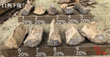 --------------下段------------------ 保管場所:東側 11 列目の下段から10本の薪を選ぶ 積み方 :井桁 測定箇所:薪の中心に近いところを測定するため割る 測定結果:20〜21%・平均:20.1%(11列目)注:扇型の断面は三角形、弓形の断面は半円として簡易な 計算とした
