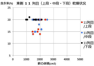 <東側11列目グラフ>横軸は薪の体積(cm3) / 縦軸が含水率(%)