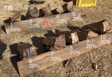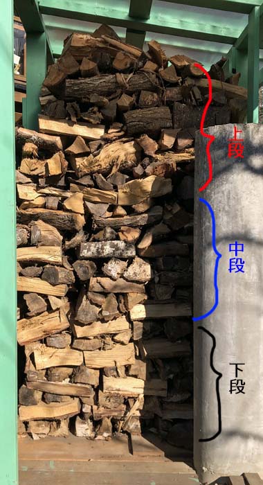 --------------中段------------------ 保管場所:東側2列目の中段から10本の薪を選ぶ 測定箇所:下段と同様 測定結果:11%〜20%(ストーブで燃やせる)