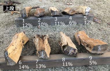 --------------上段------------------ 保管場所:東側2列目の上段から9本の薪を選ぶ 測定箇所:下段と同様 測定結果:5〜14%(ストーブで燃やせる)