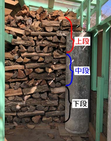 --------------中段------------------ 保管場所:東側5列目の中段から10本の薪を選ぶ 測定箇所:下段と同様 測定結果:11%〜20%(ストーブで燃やせる)注:扇型の断面は三角形、弓形の断面は半円として 簡易な計算とした