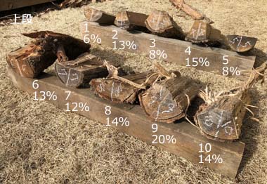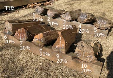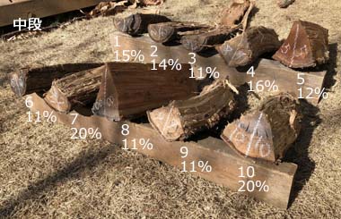 --------------下段------------------ 保管場所:東側5列目の下段から10本の薪を選ぶ 積み方 :井桁 測定箇所:薪の中心に近いところを測定するため割る 測定結果:20%(ストーブで燃やせる)注:扇型の断面は三角形、弓形の断面は半円として簡易な 計算とした
