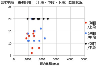 <東側5列目グラフ>横軸は薪の体積(cm3) / 縦軸が含水率(%)