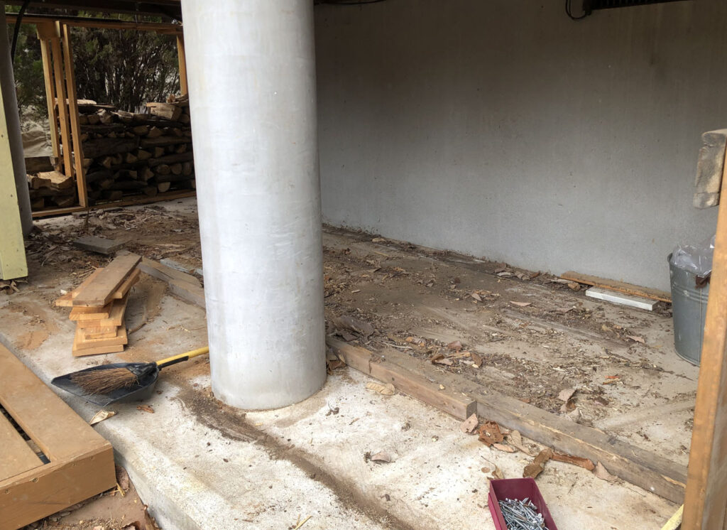 空いた薪置き場のスノコと仕切りを外して掃除を行う。ここで乾燥させた薪(約2年保管で下段の薪)の含水率は21%が最高となった。