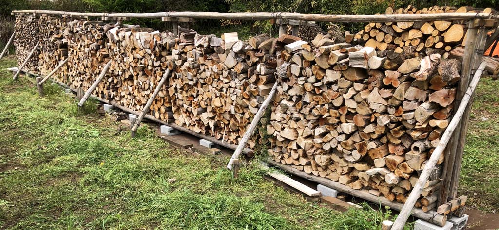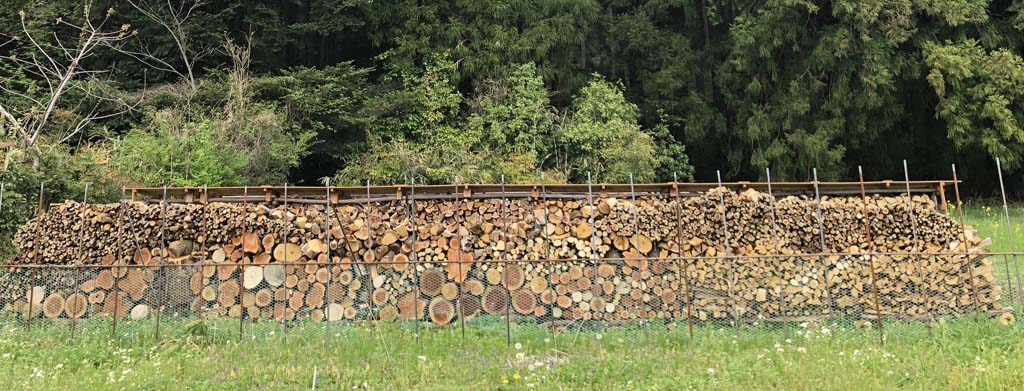 2023-24年薪活結果 薪活とストーブ 2024-04-19 2023-24年薪活で作った薪や玉切りした丸太を薪置き場に運び終えた。まだ丸太の物もあるが幅約10m x 高さ約1.2mで3列分と想定以上(嬉しい誤算)に集まった。 右手奥にも玉切り状態で残っている。(屋根を付けねば) 2列のうち1列分は野ざらし状態 頂いた樹木の種類 ・ウメ ・カエデ ・クリ ・ポプラ ・ケヤキ ・ミズキ ・モチノキ など梅雨入前には屋根を設けることと、新規に1列分の薪ラックを作成(DIY)する予定で、薪に関わる作業が続くなぁ〜。