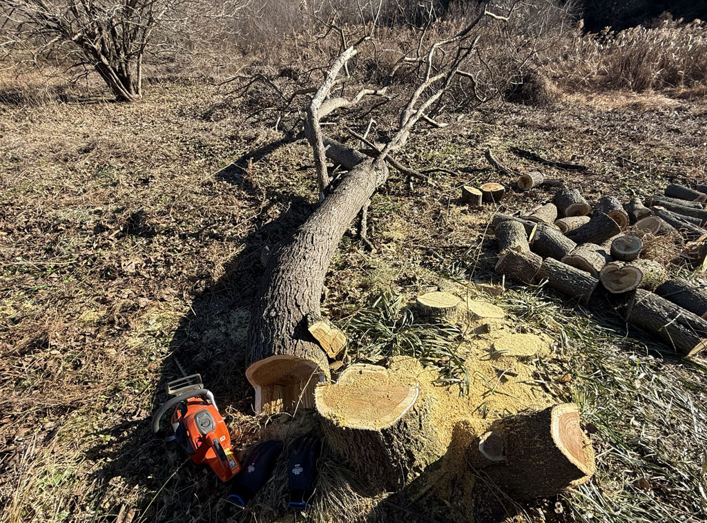 来週は、薪割りとここで薪積みを行う予定です。薪積みをする理由は、2026年3月頃に保管場所へ薪を移す予定で、その時までに薪を乾燥させておけば、重量が軽くなり運ぶ作業が楽になります。