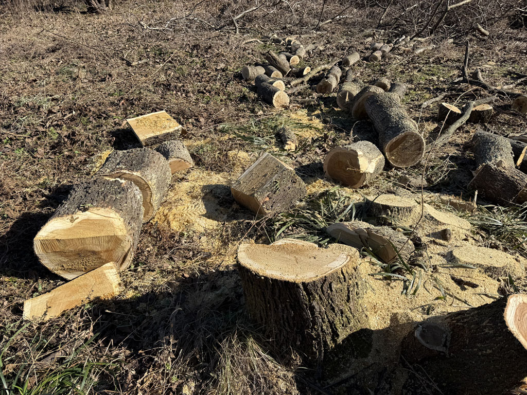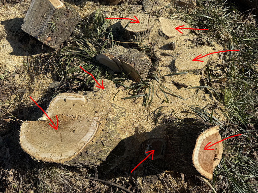 先週の続きで株立の残りの木を伐る作業から薪割りまで進めましたが、最後の1本(上記写真)は、伐木と玉切り作業で終りました。