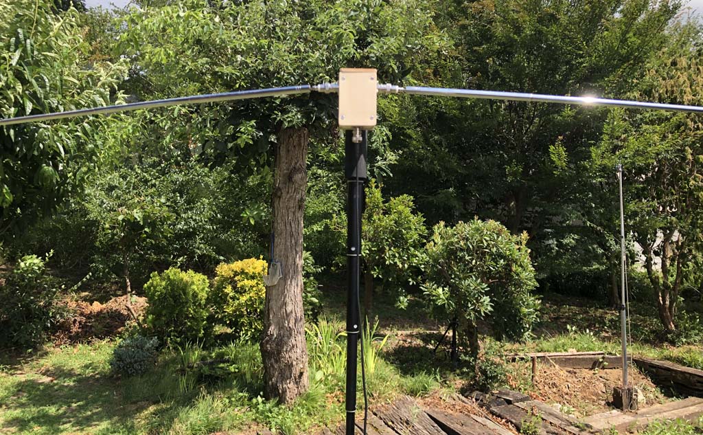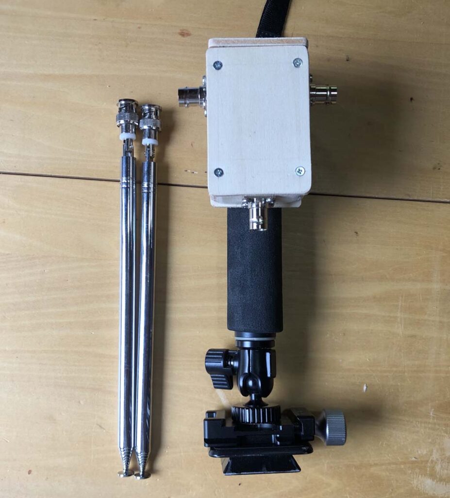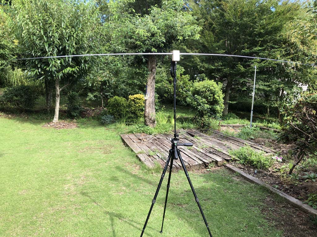 ロッドアンテナ取付部のBCNコネクターのガタと自重により、展開したら「ハの字」になってしまった。給電部高さは三脚と自撮り棒を合わせて2m弱となった。