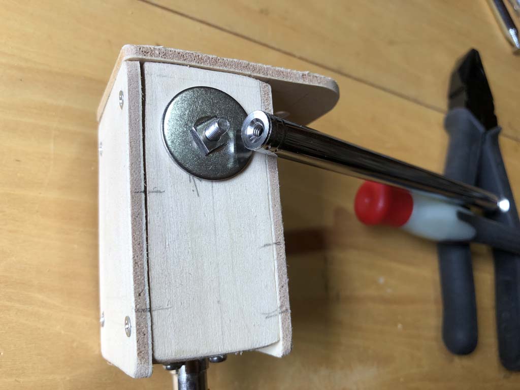 ケース上面にプレート(シナ合板)を追加してスマホ用の自撮り棒に固定できるようにした
